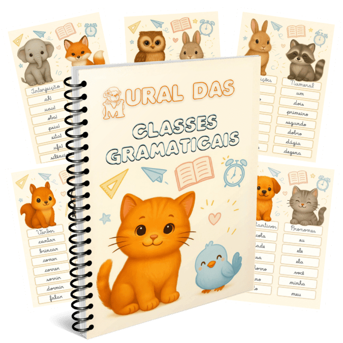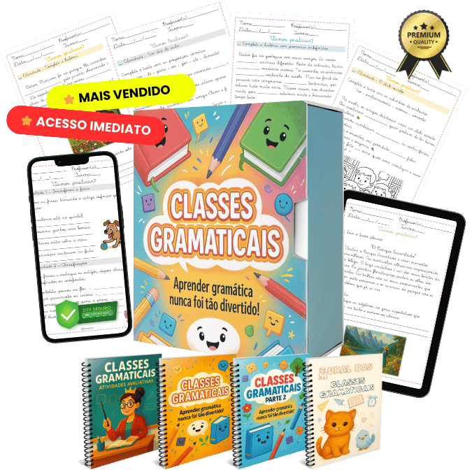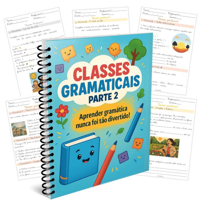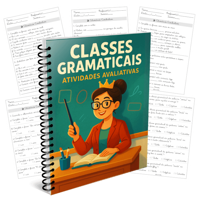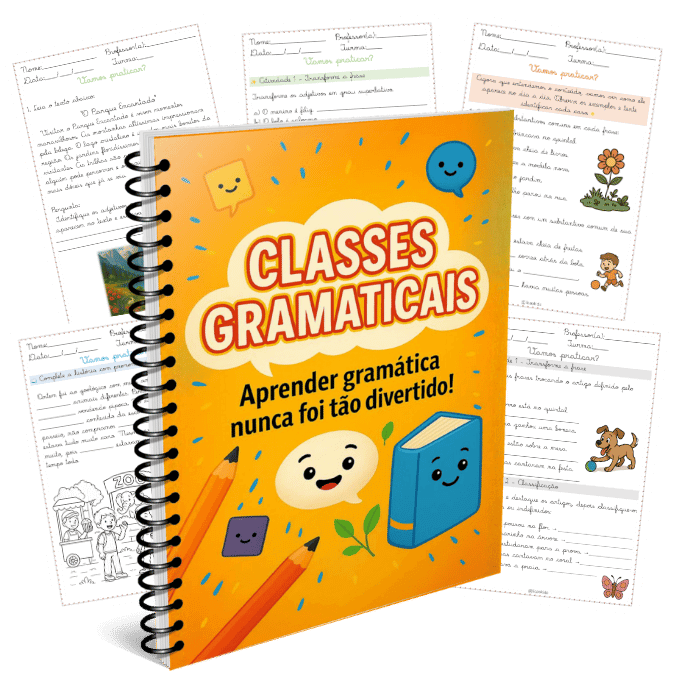 Material aborda classes gramaticais com foco em substantivos, artigos, adjetivos e pronomes. Trabalha conceitos, classificações (comum, próprio, coletivo, simples, composto, primitivo e derivado), exemplos contextualizados e atividades práticas para identificação, uso correto e produção de frases.